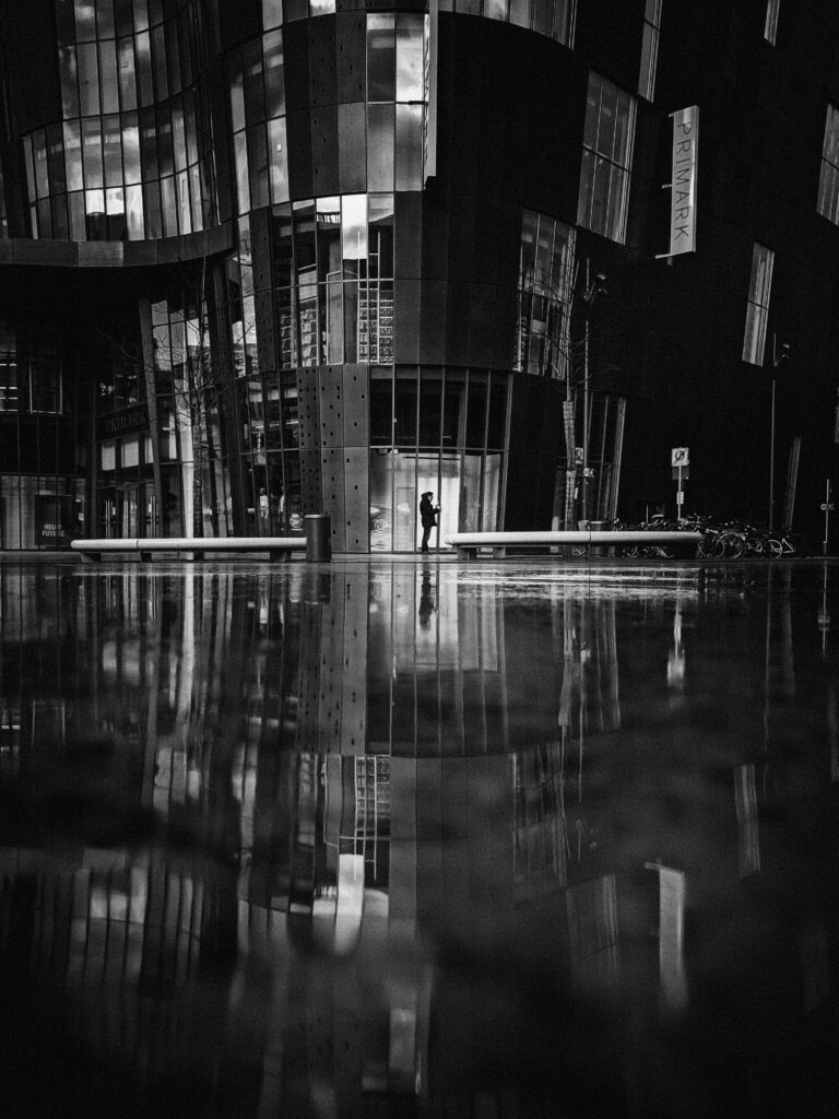 Besonders jene Aufnahmen, die entstanden sind, als ich noch in Wuppertal lebte und dort viel und oft fotografierte. Beim Durchsehen merke ich, dass mich bestimmte Motive nie wirklich losgelassen haben. Spiegelungen zum Beispiel. Ich bin nach wie vor fasziniert von Pfützen, von dem, was sie zeigen – und von dem, was sie verzerren. Diese leicht verschobenen Realitäten. Dazu kommen die ungewöhnlichen Perspektiven, der Blick nach unten, nach oben, schräg dazwischen. Dinge, die man im Vorbeigehen leicht übersieht.